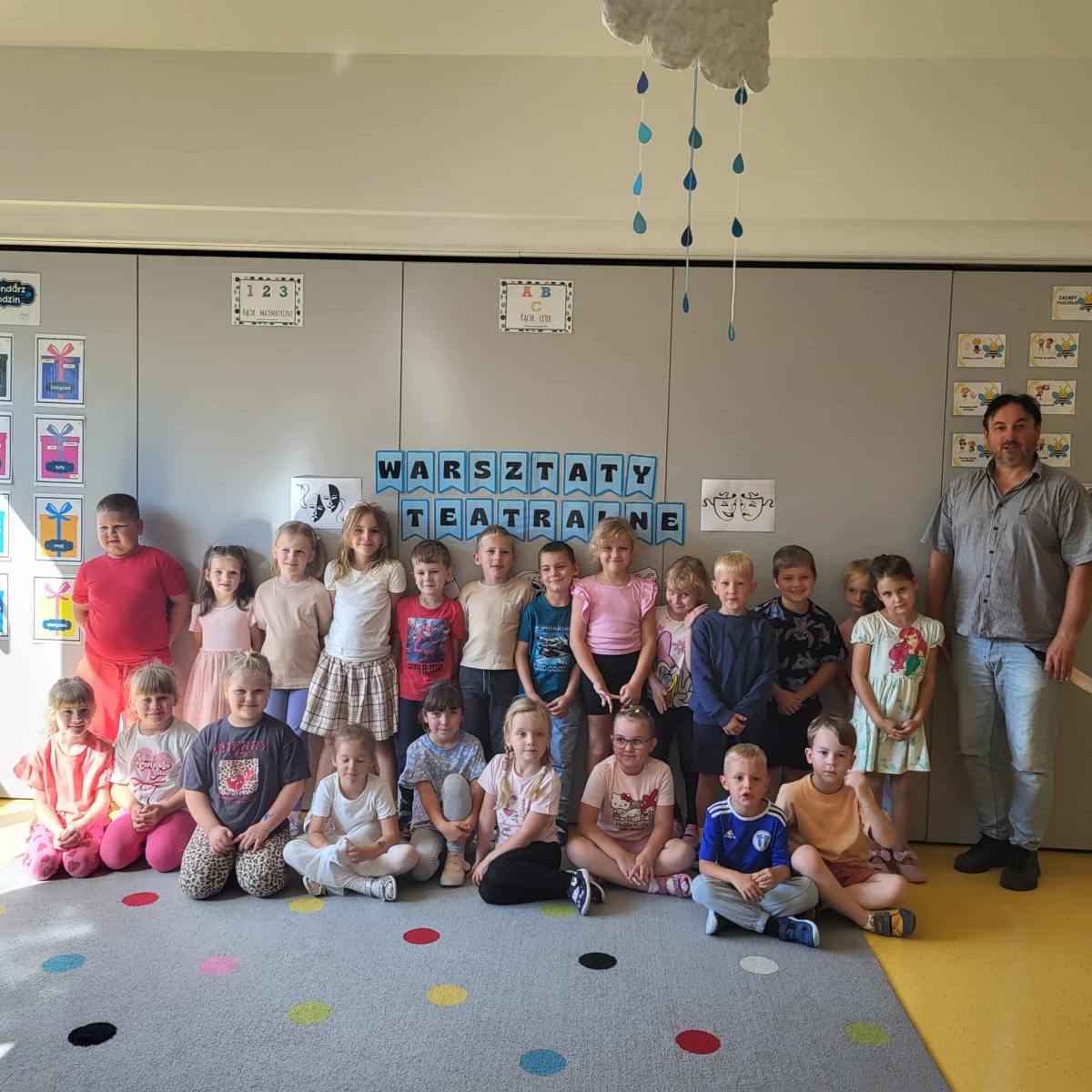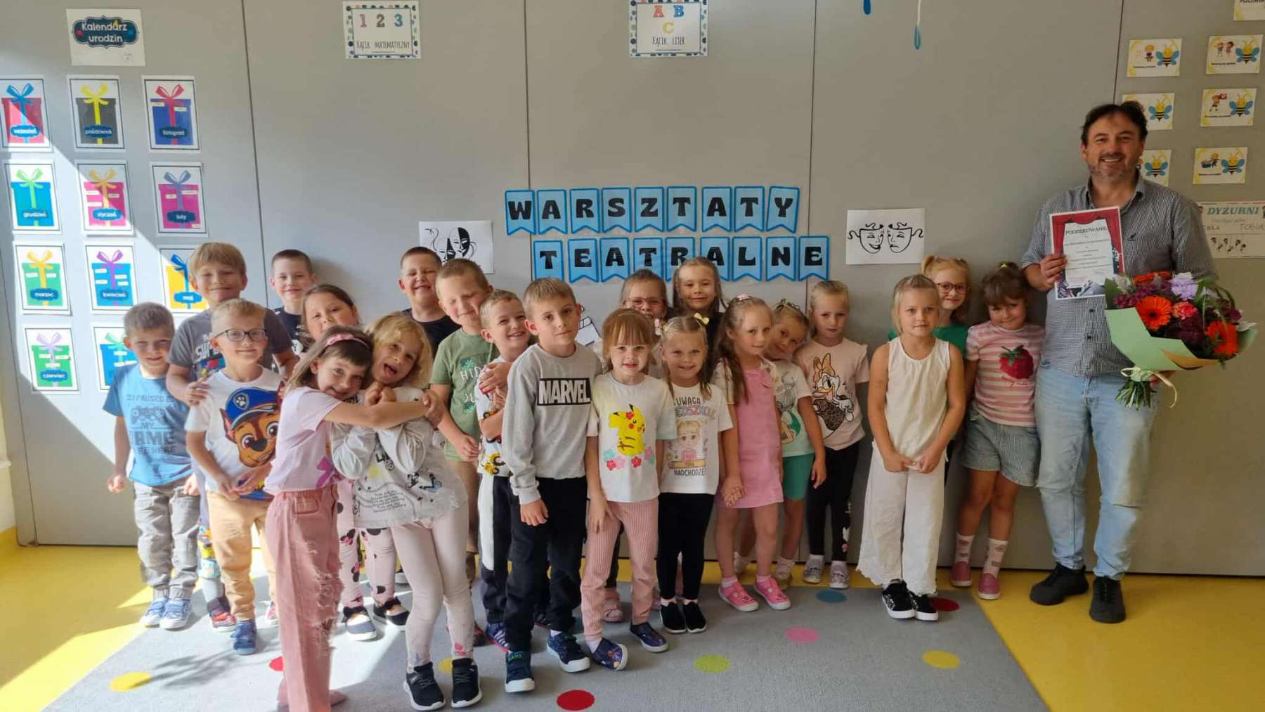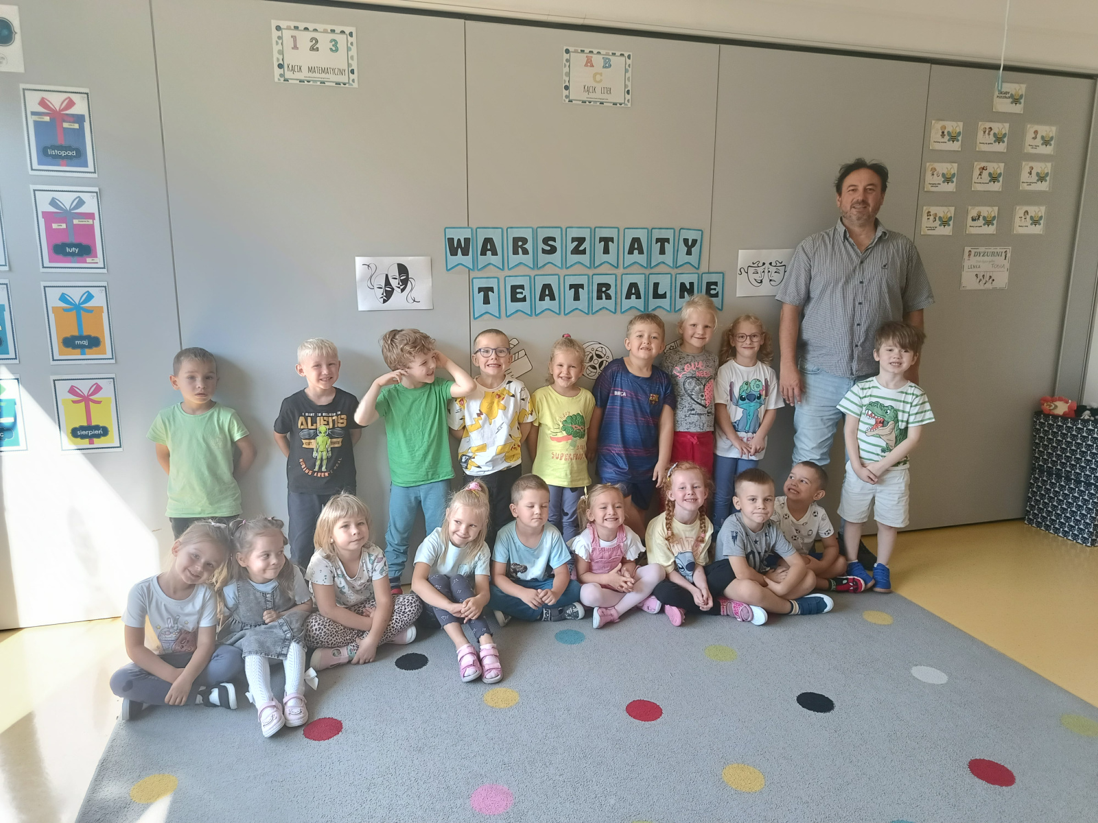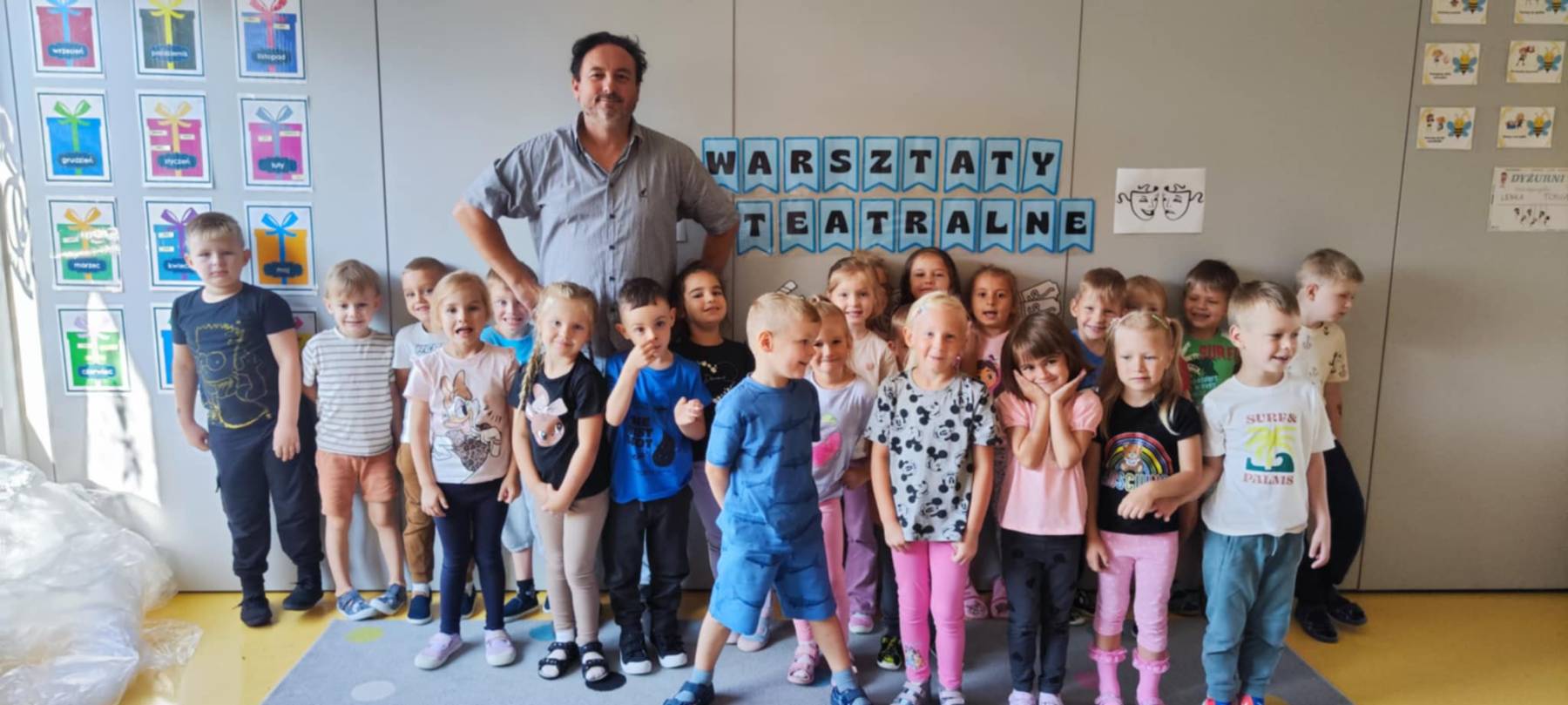 W dniu 12.09.2025 r. w naszym przedszkolu odbyły się warsztaty teatralne, które poprowadził p. Zbigniew Kozłowski – aktor teatralny, filmowy i dubbingowy. Podczas zajęć dramowych cztery najstarsze grupy z naszego przedszkola poznały specyfikę pracy aktora, ćwiczyły pantomimę, uczestniczyły w procesie dramowym uruchamiając swoją dziecięcą wyobraźnię. Celem warsztatów teatralnych dla dzieci było rozwijanie wyobraźni, mowy a także budowanie pewności siebie i umiejętności społecznych. Dzieci z ogromnym zaangażowaniem i uśmiechem na twarzy wcielały się w różne role i potrafiły wspaniale przenosić świat sztuki do naszej codzienności.