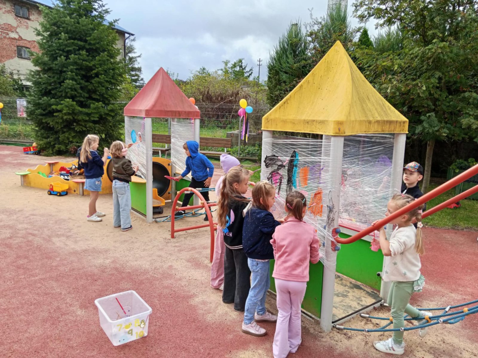 chodniki przedszkolne kredowymi rysunkami oraz malowały farbami kartonowe domki. Jednak