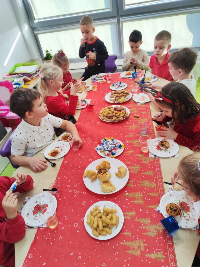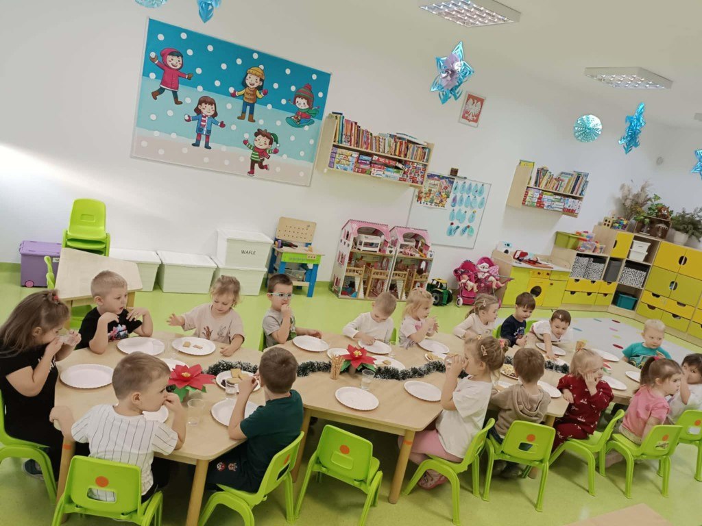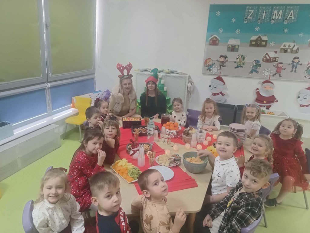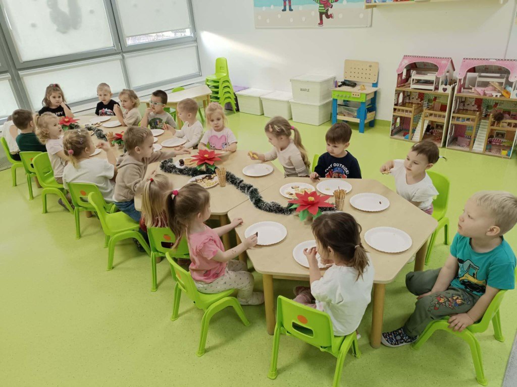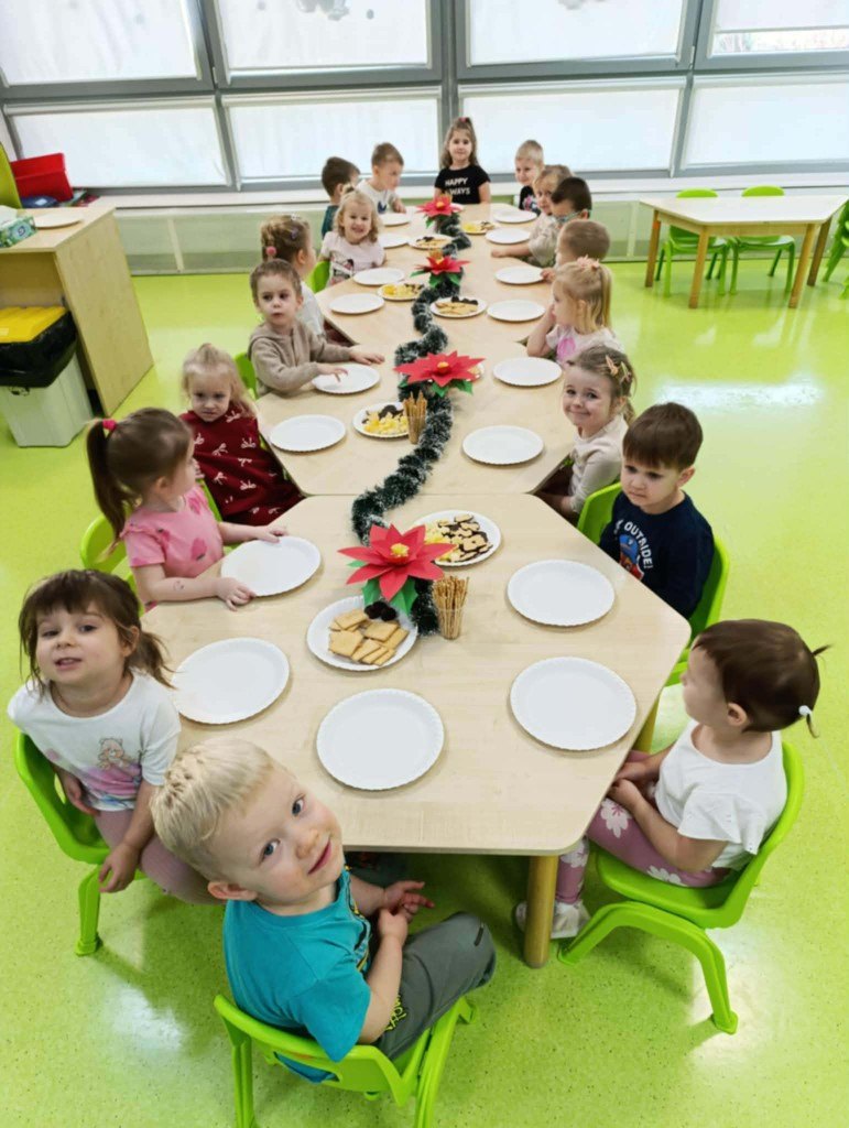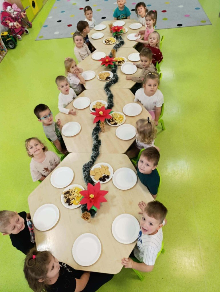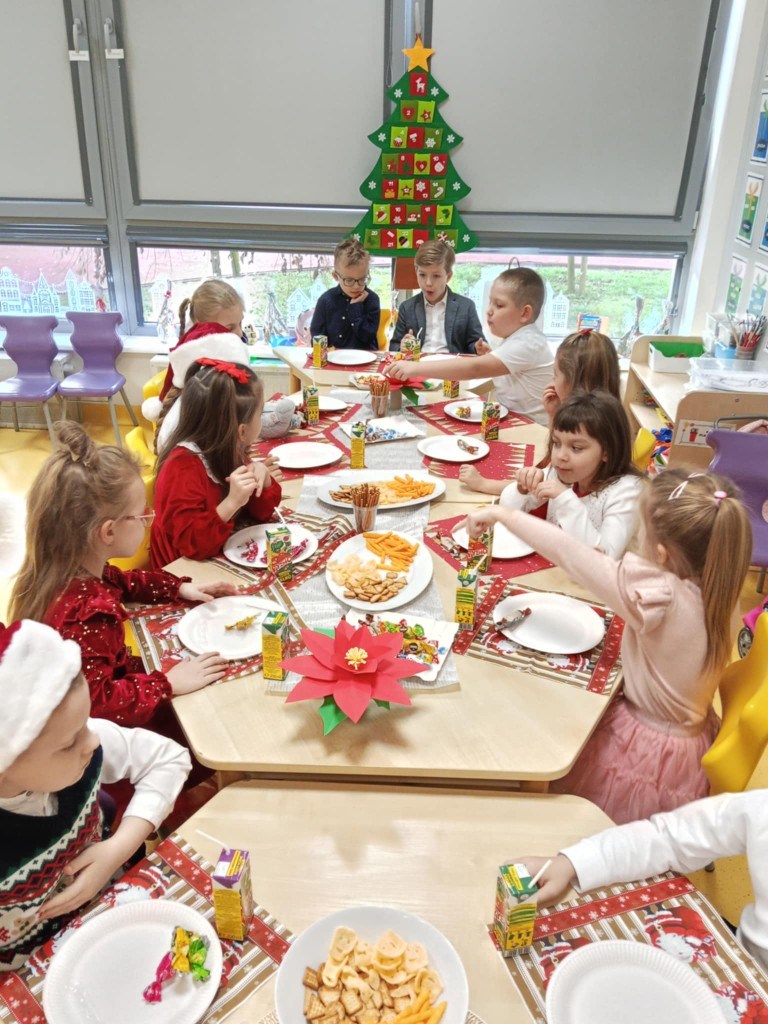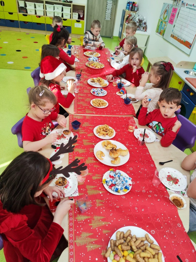 Grudzień to magiczny miesiąc, w którym czekamy na te najważniejsze dni Bożego Narodzenia 🎄 Dzieci przygotowują się do nich poprzez naukę kolęd i piosenek świątecznych 🎶 Tworzą kartki świąteczne z życzeniami, magicznie wyglądające prace plastyczne, ozdabiają pierniki. Czekają również na Wigilię grupową, podczas której składają sobie życzenia, zajadają przysmaki i spędzają razem czas. W całym przedszkolu jest sześć grup. Każda grupa czas świąteczny spędza inaczej, ale wszystkim przyświeca jedna idea, aby dzieci miło i radośnie spędzały czas w przedszkolu, przy okazji poznając tradycje bożonarodzeniowe